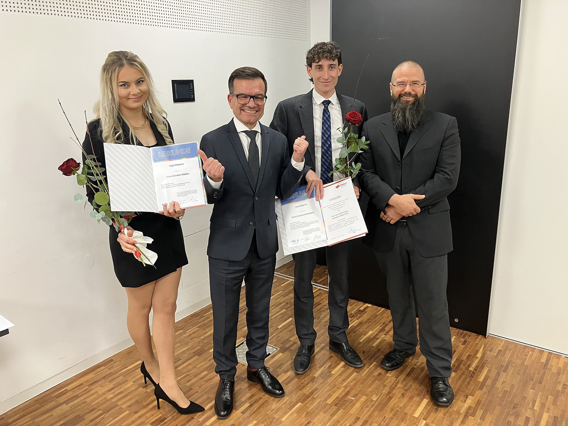 Den Preis des Verbands Spedition und Logistik Baden-Württemberg e. V. (VSL) für die beste Bachelorarbeit im Bereich Logistik erhielten Carolin Müller (C.E. Noerpel Logistik GmbH & Co. KG, Ulm) und Leonard Stimpfig (BSH Hausgeräte GmbH, Giengen) überreicht wurde dieser von Herr Marongiu, Geschäftsführer des VSL (Zweiter von links). Die Studiengangsleiter Prof. Dr. Carsten Wander (rechts im Bild) und Prof. Dr. Alexander Rief gratulieren zum verdienten Preis.