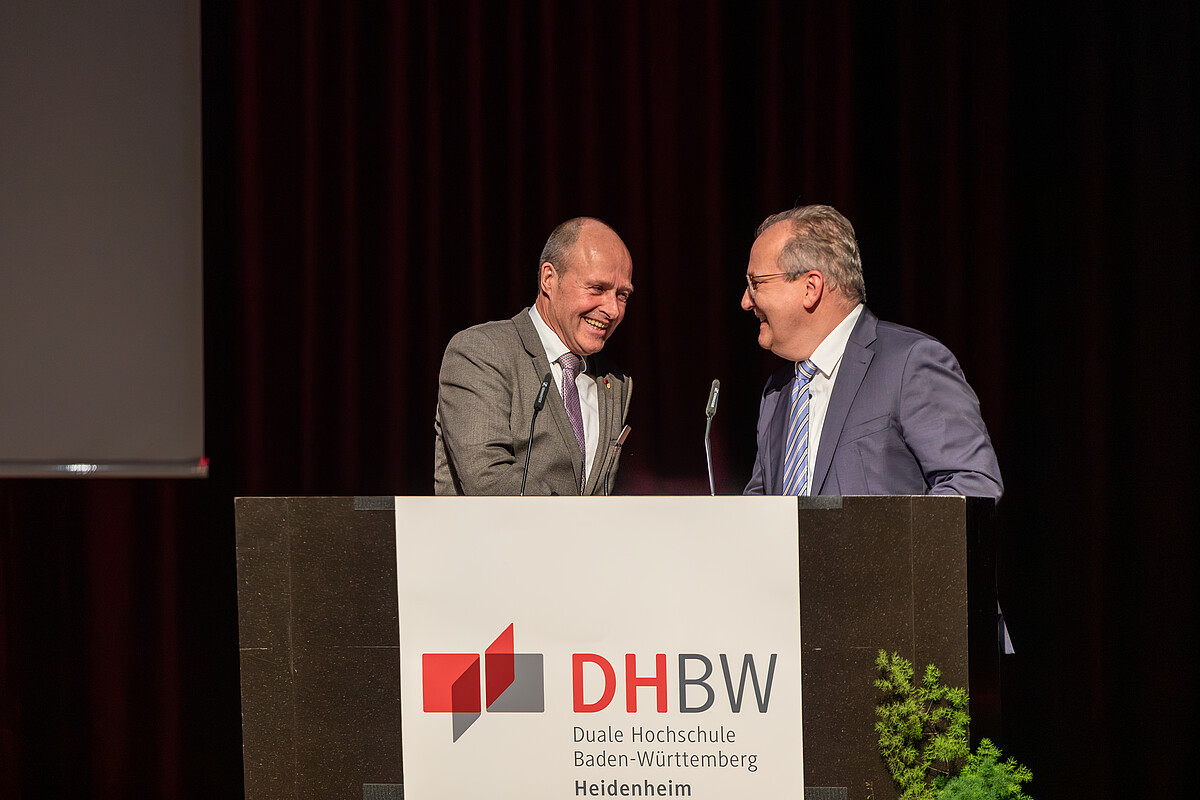 „Ich hatte das Glück, mit der DHBW Heidenheim eine Musterakademie zu übernehmen, und durfte diese in den vergangenen acht Jahren weiterentwickeln“, fasst Prof. Dr.-Ing. Dr. Rainer Przywara seine Zeit in Heidenheim zusammen. „Ich habe Heidenheim als eine außergewöhnliche Region nicht nur kennen, sondern auch lieben gelernt und gehe in großer Dankbarkeit!“ Seit seinem Amtsantritt zum 1. Oktober 2017 als Rektor der DHBW Heidenheim trug Prof. Dr.-Ing. Dr. Rainer Przywara maßgeblich zur strategischen Entwicklung des Standortes bei. Besondere Schwerpunkte lagen auf Digitalisierung, Akademisierung des Gesundheitswesens und regionaler Verankerung. Seine Wiederwahl im Mai 2023 unterstrich das Vertrauen in seine Führung und den eingeschlagenen Weg. Fragt man den Rektor nach seinem größten Erfolg seiner gut achtjährigen Amtszeit nennt er die Stabilität des Leitungsteams der DHBW Heidenheim. „Sich stets aufeinander verlassen zu können und gleichzeitig alle Beschäftigten zum Mitdenken zu ermutigen, das sehe ich als Schlüssel zum Erfolg der vergangenen Jahre. Ich bin froh und auch ein wenig stolz, dass das so gut gelungen ist!“, resümiert Rektor Przywara.